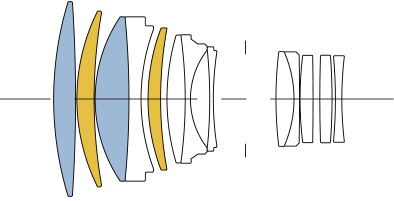 Do budowy obiektywu wykorzystano 13 soczewek, ułożonych w 10 grupach. Wśród nich znalazły się dwie soczewki ze specjalnych szkieł SLD*, dwie FLD** o włąściwościach fluorytu oraz elementy asferyczne, zapewniające ostrość obrazu również na brzegach kadru
